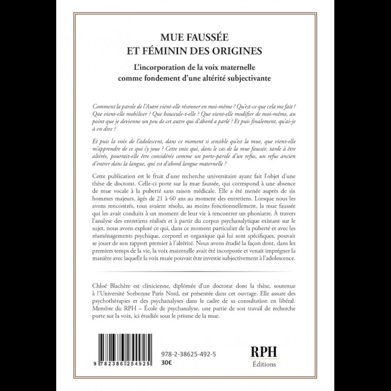 Chloé Blachère est clinicienne, diplômée d’un doctorat dont la thèse, soutenue à l’Université Sorbonne Paris Nord, est présentée dans cet ouvrage. Elle assure des psychothérapies et des psychanalyses dans le cadre de sa consultation en libéral. Membre du RPH – École de psychanalyse, une partie de son travail de recherche porte sur la voix, ici étudiée sous le prisme de la mue.